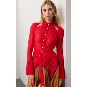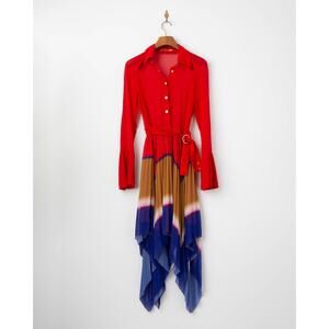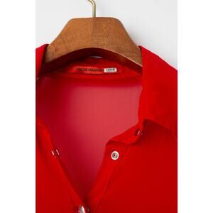 Red (100% Polyester). Cocktail Dress. Collared. Long Sleeve. Front button closure.