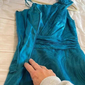 Theia 100% Silk Off Shoulder Green Cocktail Dress Knee Length Size 4. Beautiful design in fabric and flattering top snd shoulder design with an a-line skirt. Formal or similar formal or cruise dinner wear. Very versatile! Good pre owned condition. One flaw as shown in last photo.