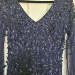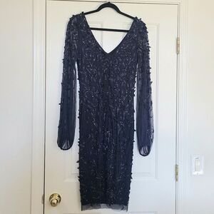 Theia Beaded Navy Embellished Lantern Sleeve Sheath Dress Size XS Cocktail Party