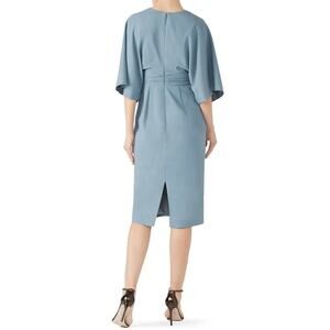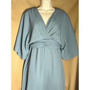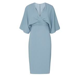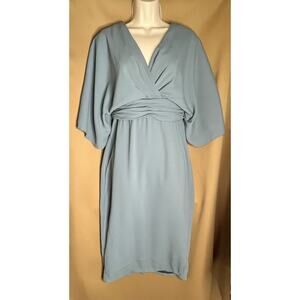Blue charmeuse sheath dress. 100% polyester. Three quarter sleeves. V-neckline. Hidden back zipper with hook and eye closure. Fully lined. 44.5” from B shoulder to hemline.