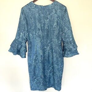 Theia Cloque Bell Sleeve Cocktail Dress 12 French Blue Back Zip Lightweight $695