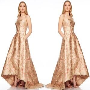 Theia Couture Strapless Gold Embroidery Overlay Scalloped Train Gown SZ 8