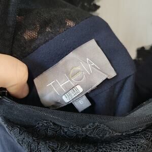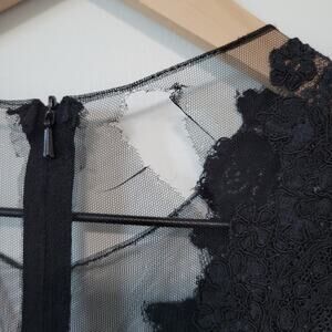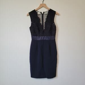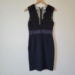 Features: Blue and black lace (100% polyester). Sleeveless. V-neckline. Fitted skirt. Hidden back zipper with hook-and-eye closure. Fully lined. Mesh front and back cut out. 39” from shoulder to hem.