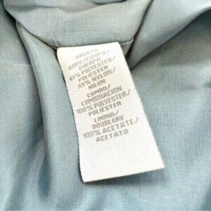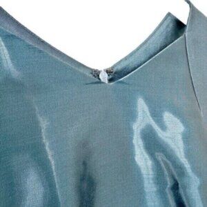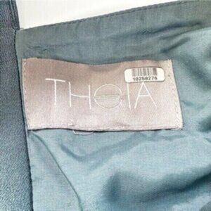 Liquid Glass dress by Theia. Arctic blue color. Crepe material. Sleeveless. Halter-like neckline. Cutout detail on back. Sheath dress silhouette. Fitted skirt. Hidden back zipper with hook and eye closure. Fully lined. Some minor pulling on fabric on neckline (see photo), but not super noticeable when worn given the material. In otherwise excellent condition! Size tag has been removed, but it is a size 6. Please double check measurements below.