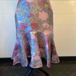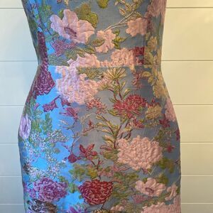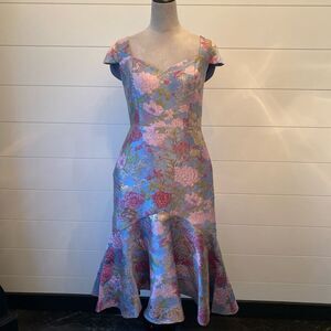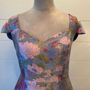 The Logen Jacquard Cocktail Dress is a playful yet poised ensemble, featuring a multi-colored structured jacquard fabric that shapes its fit-to-flare silhouette. Petal-like cap sleeves embrace the arms, complementing the sweetheart neckline, while the skirt flares just below the knee, exuding a flirtatious charm perfect for any sophisticated gathering.