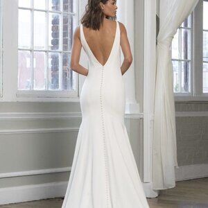 Theia Lynda is a chic crepe fit and flare gown. This simplistic look is elevated by the V neckline and thick straps that outline a low V back. Covered buttons line the back for a touch of glamor!