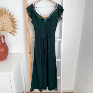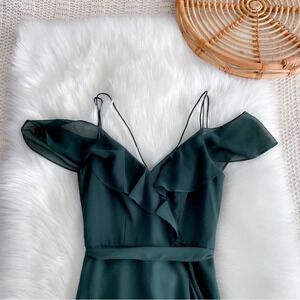 Theia Off The Shoulder Maxi Dres Gown Forest Green Bridesmaid Front Slit Ruffle