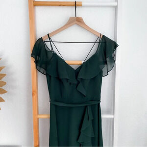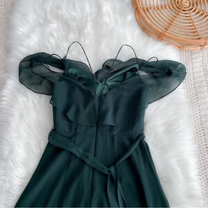 Forest deep green color. Beautiful evening gown. Great for a weeding/bridesmaid. Off the shoulder look with straps, back zipper closure, front slit with Ruffle detailing, tie waist.