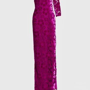 Elegant one-shoulder maxi dress. Features floral lace design. Perfect for evening events.