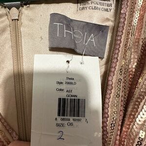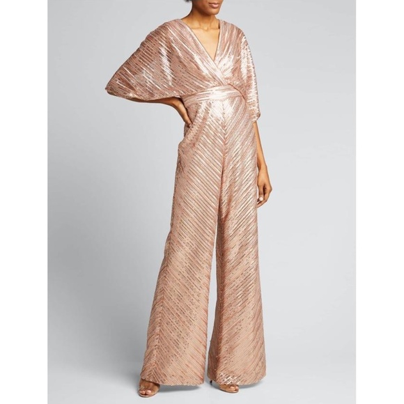 Theia Sequin Embroidered Tulle Kimono Jumpsuit in pink/rose gold. It has the merch tag on it, but I think it has traveled and has incurred some sequin casualties along the way. Has a small spot on the back near center waistline where a few sequins are missing, and same on the front left leg near the bottom (see last two photos). I think there might be a strip of micro sequins missing on one of the legs, too, but you have to REALLY be looking to see that. Sequin loss in general is minimal on this piece, but it IS there. And if you know micro-sequins, you know they really stick to each other. Sample piece with no fabric tag sewn in (100% polyester). Brand tag is also falling off. Super hard to find this item online, but looks like it was sold at Bergdorf Goodman. Size 2.