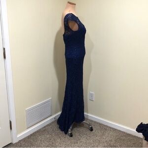 Excellent condition no stains rips or fading. No fraying on the hem. Short sleeve, cap sleeve, sweetheart neckline with sheer illusion lace overlay with crewneck, scoop back, mermaid trumpet silhouette long gown with short train. Dark blue with subtle electric blue metallic lurex threading throughout. Some slight give to the fabric so it can fit a true size 22. Padded and boned bodice