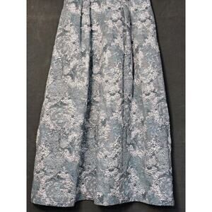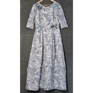 Elegant Theia short sleeve A-line gown in size 14. The dress features a stunning silver-blue metallic jacquard pattern, beautifully accented with delicate beaded floral details. This gown is perfect for special occasions, offering a sophisticated and graceful look.