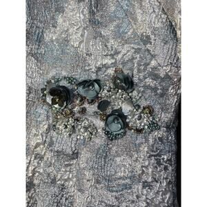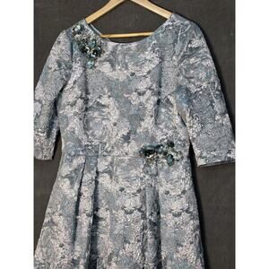 Theia Short Sleeve Metallic Jacquard A Line Gown Size 14 Silver Blue Beaded Flor