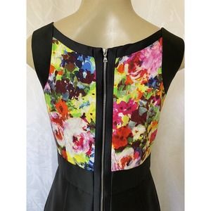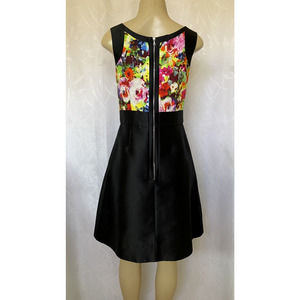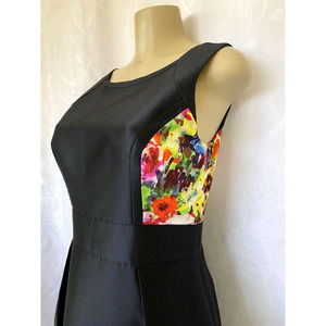 Theia Taffeta Dress Fit Flare Black Floral Sleeveless Scoop Neck Back zi…