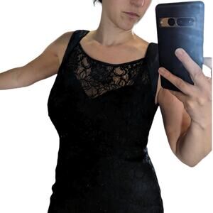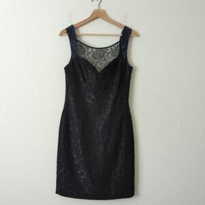 Theia women's dress size 8. navy blue with black lace overlay sleeveless metallic thread style 881694 cocktail dress sweetheart and neckline pit to pit 18. pit to hem. 29". In very good pre-owned condition.