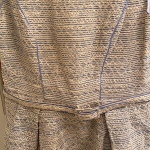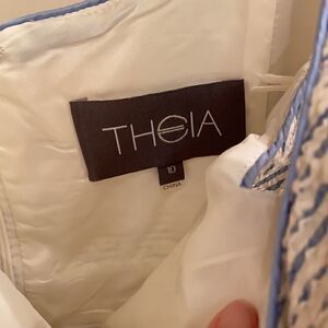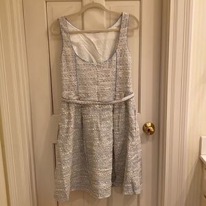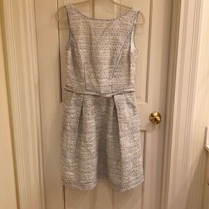 Theia Cream Tweed A-line Sleeveless Blue Pockets Night Out Dress. Belted at waist.