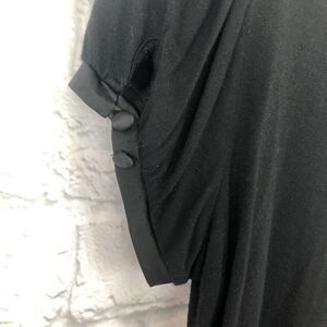 The limited black blouse with satin v neck line and satin with buttons around the arm sleeve