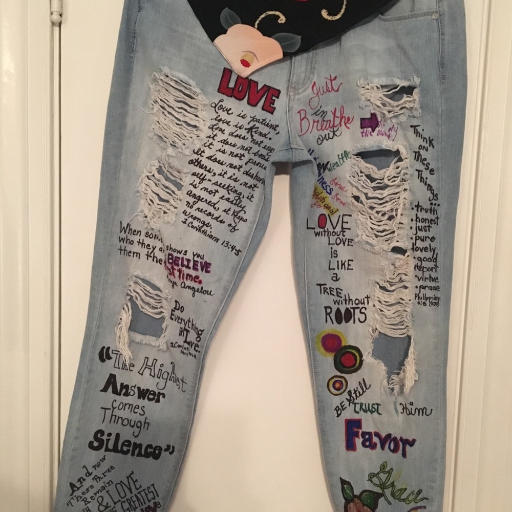 Jeans with personal messages! These are not for sell, just a promo to see if there is any interest! Please leave a comment below and tell me if you like the style and list a theme you would like to see on a pair