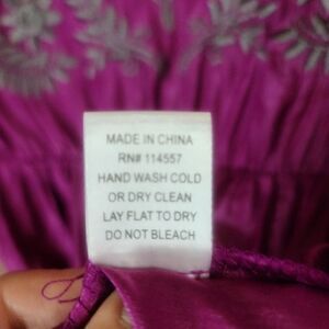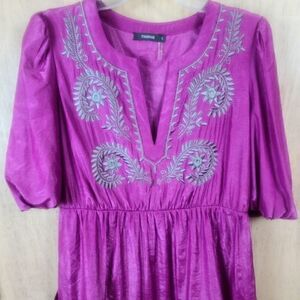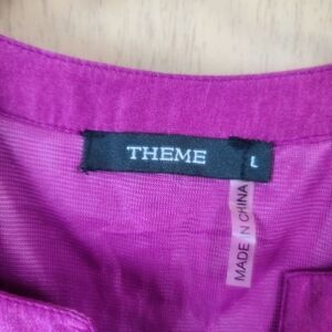 Theme Ornate Blouse w/V-neck and silver embroidery that envelopes the chest and neck, around bottom and in back. The 3/4 length sleeves have a slight balloon effect w/ elastic on cuffs. Purple-Magenta in color. SZ L NWOT NEVER BEEN WORN