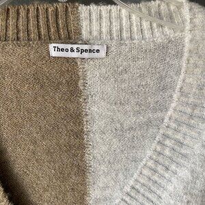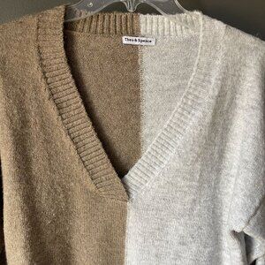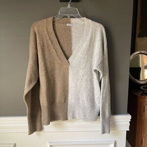 Theo & Spence V-neck Tan Gray Colorblock Soft Sweater Oversized Womens Sz Small