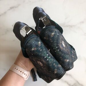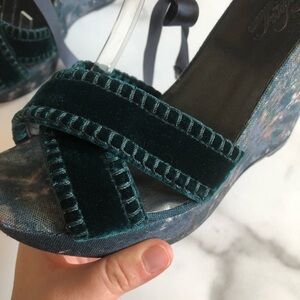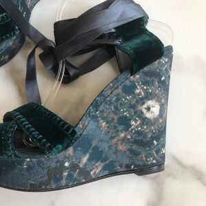 Tie dye print on the wedge heel. Whipstitched edges on the velvet crisscross vamp straps. Cutout heel cap. Leather lining and sole.