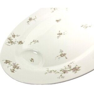 Theodore Haviland Limoges France 16-inch oval platter features the classic Pink Spray pattern, showcasing delicate pink floral accents with fine detailing and a soft, elegant finish. Crafted in Limoges, it reflects the quality and artistry associated with early Haviland porcelain. The platter remains in beautiful condition for its age and makes an excellent display piece or functional addition to a vintage table setting.