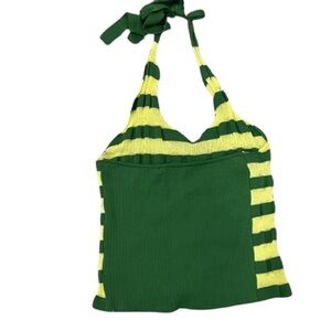 Green and yellow knit (80% Rayon, 20% Nylon), contrast (72% Rayon, 28% Polyester). Top. Halter neckline. Sleeveless. Pull-on. 17" from shoulder to hemline. Imported.