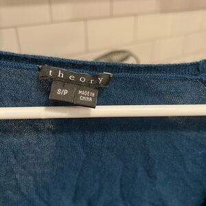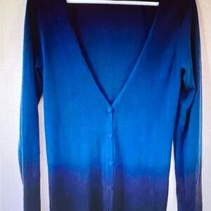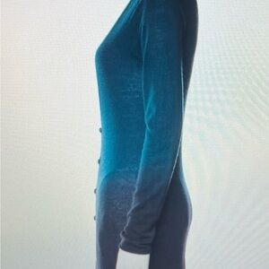 Elegant 100% cashmere blue ombré cardigan by Theory with cashmere covered buttons. Ideal for versatile styling. Small repair stitch made to the back. Softest thing I’ve ever owned and cannot usually wear anything other than cotton due to sensitive skin. The quality of this cashmere is appropriate for sensitive skin.