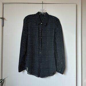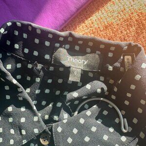 Size S. Theory 100% silk semi sheer button up blouse. The pattern reads modern polka dots with a square shape. This is gorgeous on with a black cami underneath. There is some slight damage to the front buttons, shown but they are still functional. This is beautiful work alone or under a jacket at work.