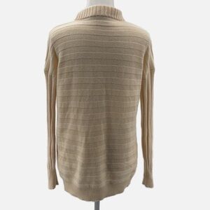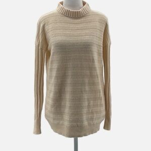 Theory Andrista Mock Neck Cashmere Sweater in Cream Beige - Size Small. Great pre-owned condition. Dimensional tone on tone ribbed stripes, mock neckline, 100% cashmere, drop shoulders. Ribbed at neckline, sleeve cuffs and hemline. Approximate measurements: 20" pit to pit, 26" length. Darker than a cream, lighter than a beige.