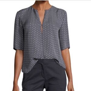 Theory blouse with deeply slit neckline tethered with a single stitch adds a modern touch to a relaxed top cut from flowy silk with a springy navy-and-white print.