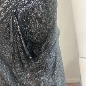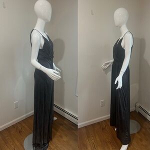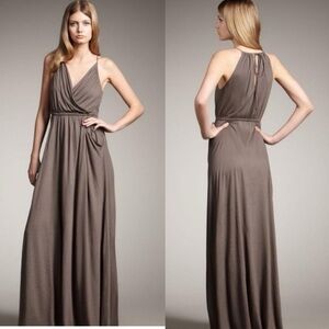 The Athler maxi dress by Theory in size small. Surplice wrap, with halter style neckline that ties in back with keyhole detailing. Slouchy side pockets. Stock photos are of different color way but same dress and used for style inspo and fit. Floor length. Black with micro dot design, very neutral.