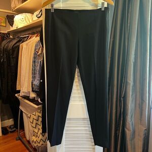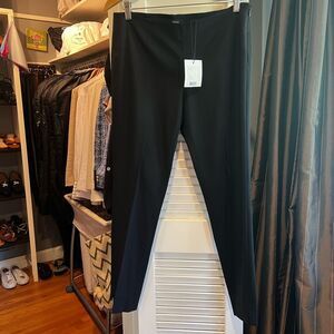 Theory Belisa pants, specifically in the Sevona Stretch Wool fabric, which are a style of slim-leg, ankle-length trouser. Constructed from premium Sevona stretch wool, typically a blend of virgin wool and elastane for comfort and flexibility. Features a clean waistband, invisible side zip closure, and darting details for a tailored fit. Designed with a mid-rise and slim leg, ending at ankle length. Pro pics show in navy same style pant. This style is similar to the Treeca.
