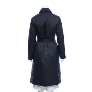 Theory puffer coat with point collar, detachable belt at waist, tonal lining and concealed button closures at front.