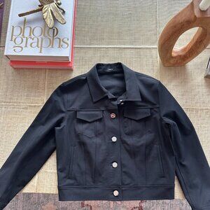 Theory black double-stretch denim jacket. Classic fit with a bit of stretch for comfort and easy layering. Clean, minimal design typical of Theory—works with denim, dresses, or trousers.
