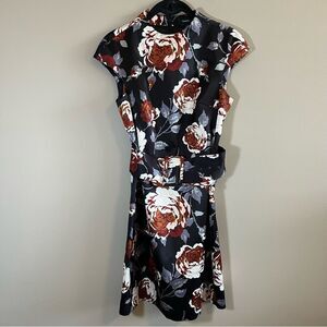 Chic mini dress with bold floral print. Features a fitted waist and cap sleeves. Perfect for any occasion.