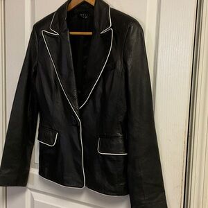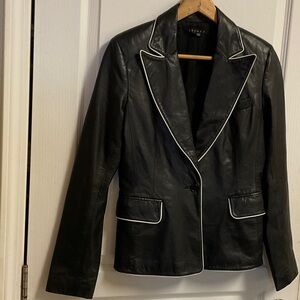Chic black leather blazer by Theory. Features stylish white piping. Ideal for a polished look.