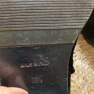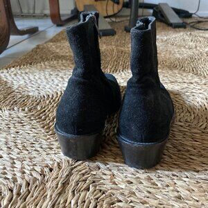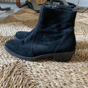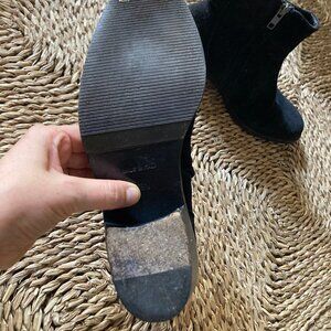 Black suede ankle boots with a stacked wooden block heel. Worn a handful of times--don't get much chance to wear these in south central Texas!