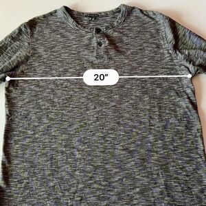 Add some colorful style to your wardrobe with this Theory black and white striped knit stretch shirt. The shirt features a crew neckline, long sleeves, and a pullover closure for easy wear. The collarless design and breathable fabric make it perfect for travel or casual occasions. This shirt is machine washable and comes in a men's size large. The striped pattern and button accents add a touch of sophistication to the shirt, making it a versatile addition to your wardrobe.