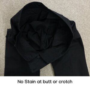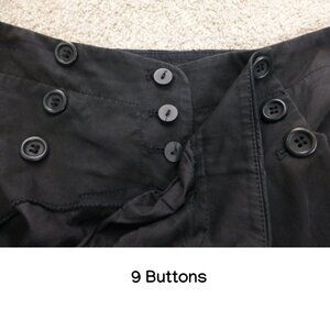 Description: Pre-owned and still in good condition. Light scuff in one part shown in picture due to storage. Please purchase responsibily, I do not accept returns. 9 buttons, 6 visible when closed. Pockets at sides. Faux pockets at back. Wide Leg.