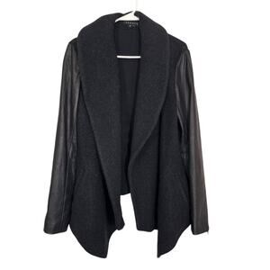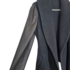 Stunning black wool and faux leather jacket from Theory. Size medium and in excellent condition. Pockets on the sides. Measures 24.5" long in the back and 31.5" long in front. Sleeves are 25" long and bust is 20"