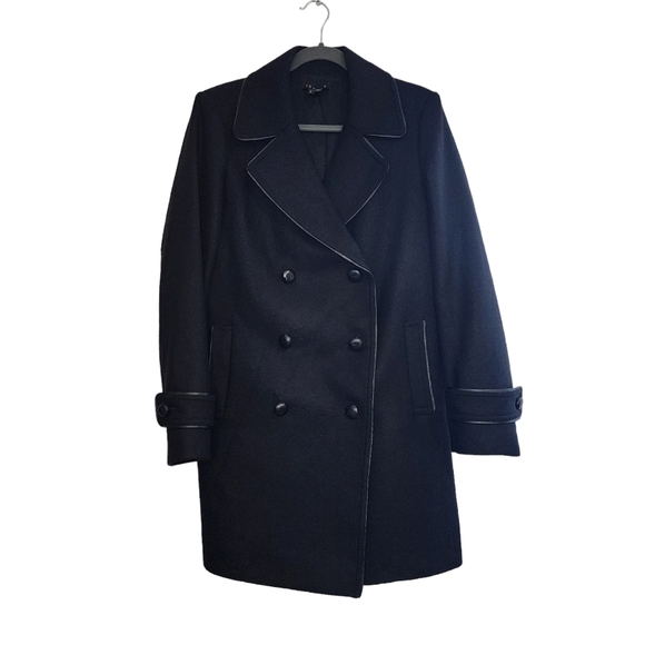 Theory Black Wool Double Breasted Loan Coat Peacoat Contrast Trim. 2 hand pockets.