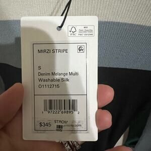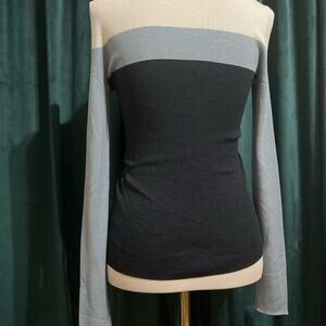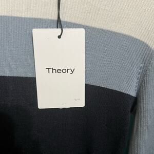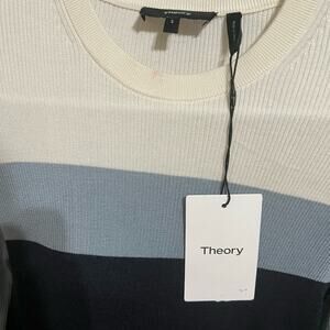 Stylish crew neck sweater by Theory. Features a black body with gray and cream accents. Long sleeves for a classic look.