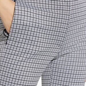 Elegant high-waited taper pants by Theory with a black and gray grid design. Ideal for a modern look. 27” inseam. Zip fly with hook and bar closure. Machine wash, dry flat.