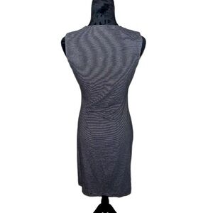 This sheath dress by Theory features a sleek ruched design in a versatile black and white, perfect for work or cocktail occasions. The sleeveless silhouette and crew neckline offer a modern and polished look, while the midi length adds a touch of elegance. Crafted from a structured fabric, this dress ensures a flattering fit and timeless appeal.