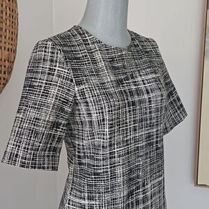 This chic black and white dress offers a sophisticated look for any occasion. Its elegant design is perfect for both professional and casual settings.