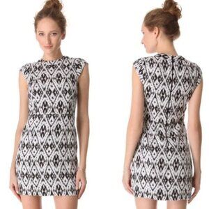 This elegant black and white dress features a striking geometric pattern, perfect for any occasion. Its classic design offers a sophisticated look. 75% polyester, 25% viscose. Dry clean only.