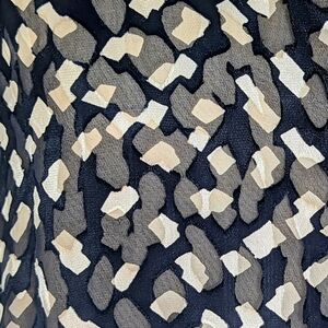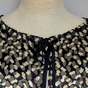 Adjustable drawstring tie neckline can be styled as a crew neck or boat neck. Long semi-sheer sleeves with smocked elastic gathered cuffs. Elasticized gathered smocked waist. Lined at bodice. Lightweight silk blend satin fabric with an allover square pattern. Slips on over head.