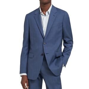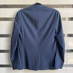 Theory men's Chambers blue blazer jacket in stretch wool blend. Wrinkle resistant fabrication for all-day polish. Features notch lapels, chest pocket, and flap pockets. Fully lined, detailed with two interior pockets, and finished buttoned cuffs. Crafted with a fine, medium-weight Italian wool suiting fabric. Structured slim fit, long sleeves. Hip length. In excellent condition. Size 36R - 16.5" shoulder in back; 29" from center back to hem; 26" from shoulder seam sleeve length.