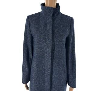 Tailored from a wool blend, this Theory Layti streamlined coat features a stand collar and a concealed button placket. Stand collar. Long sleeves. Concealed button front. Top button is decorative. Side slip pockets. Lined. Wool, polyamide, alpaca, mohair. Dry clean only. In preowned condition.